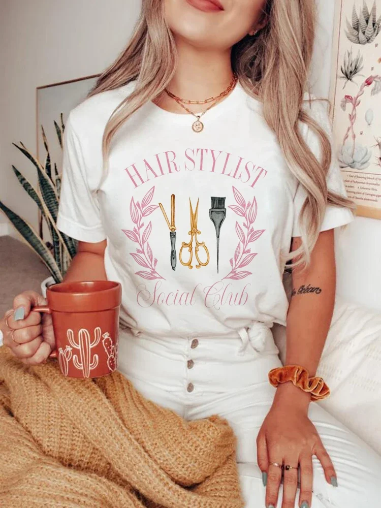 Fashion Clothing Hairstylist Printed Fun Pattern T-Shirt O-Neck Women's Short Sleeved Cute Versatile Style Clothing T-Shirt.