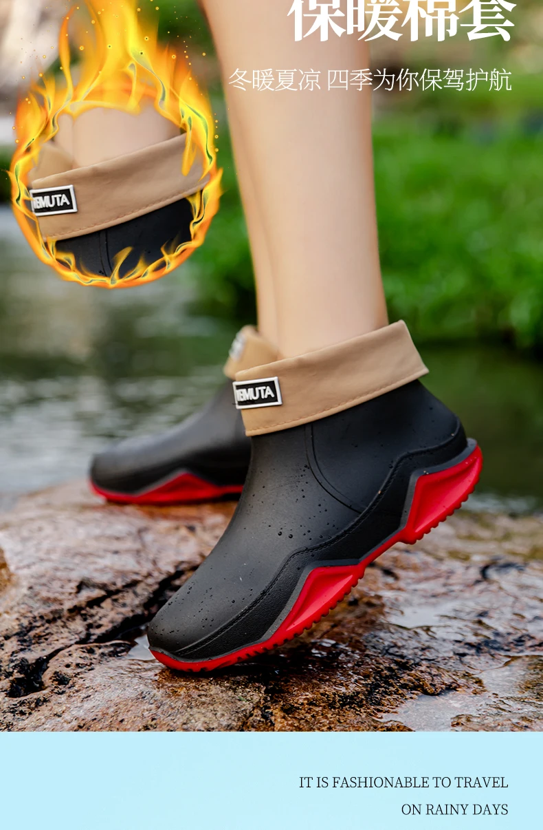 Fashion Low Top Couple's Rain Boots Men's Non-slip Chef and Work Shoe Car Wash Shoes Wear-resistant Velvet Plus Warm Water Boot