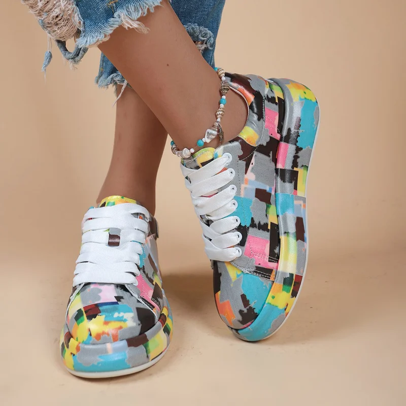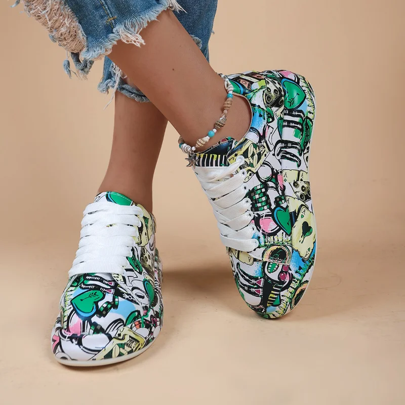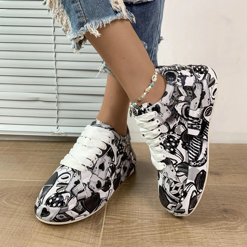 Thick-soled Increased Women's Sports Shoes Women New Women's Hand-painted Graffiti White Shoes Outdoor Casual Shoes Plus Size 43