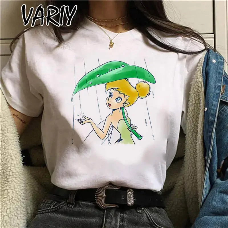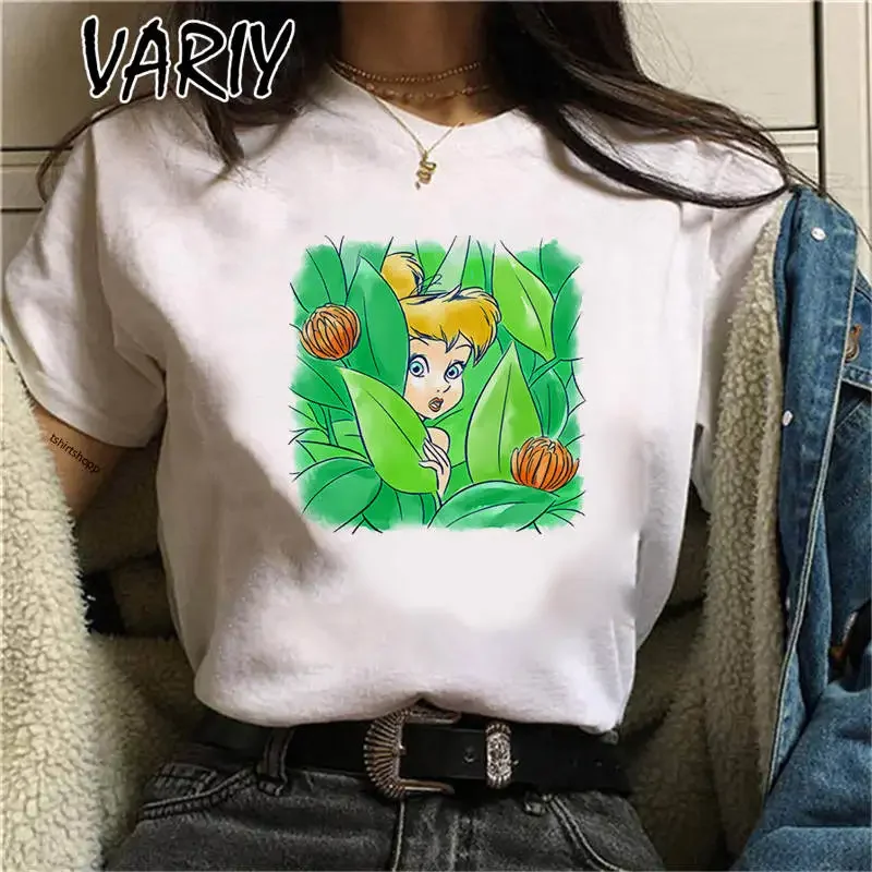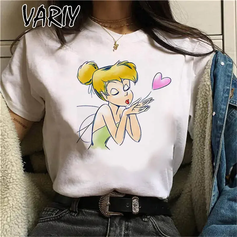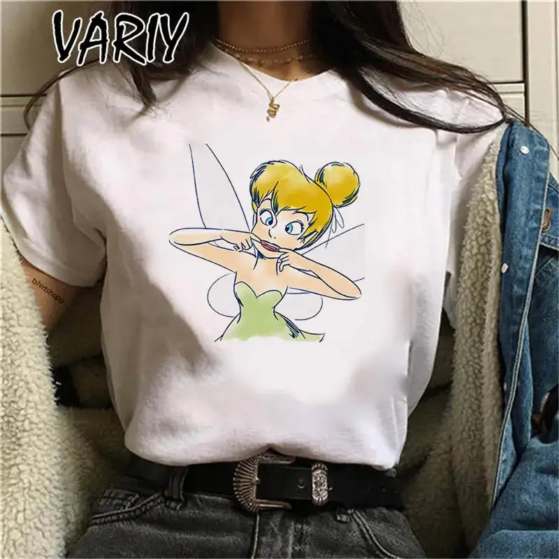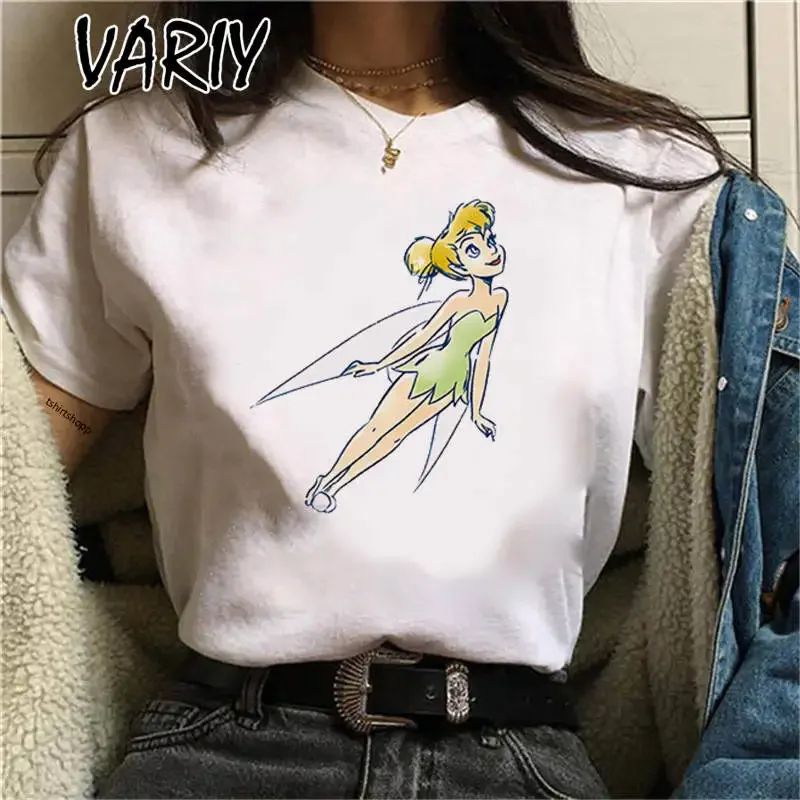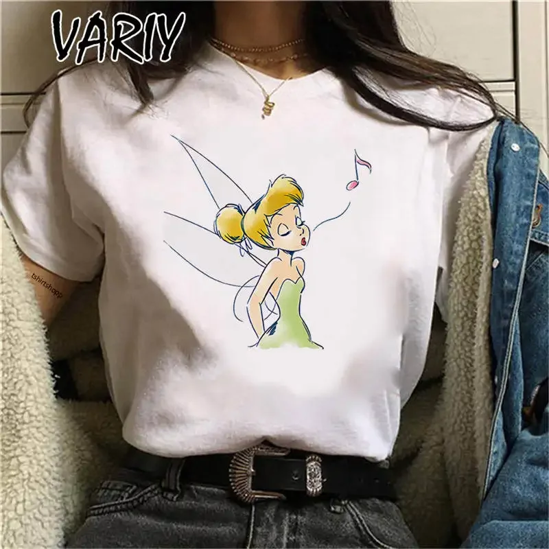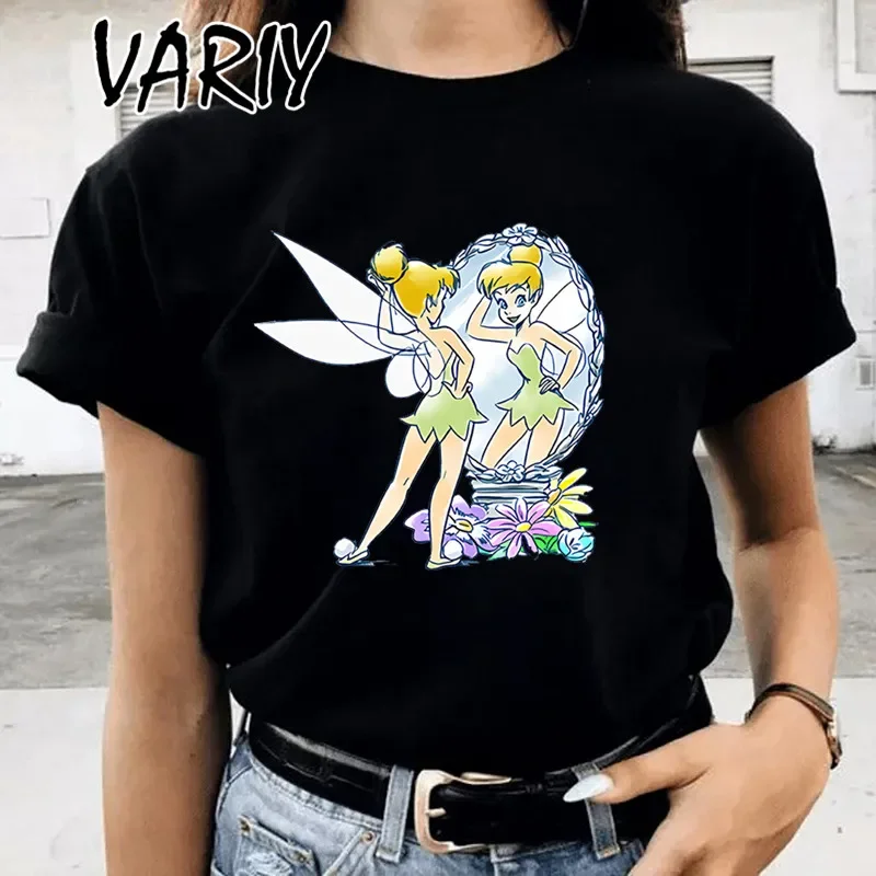 Tinker Bell Print Women's T-shirts Summer Fashion Cartoon Anime Fairy Tale Graphic Tee Shirt Oversized Cute Girl Clothes Tops