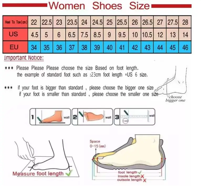 1.Please choose the appropriate size based on your foot length (from heel to toe ).The size number marked in shoe outsole is China size number, not European size. If you have any questions or concerns! please contact customer service for assistance.